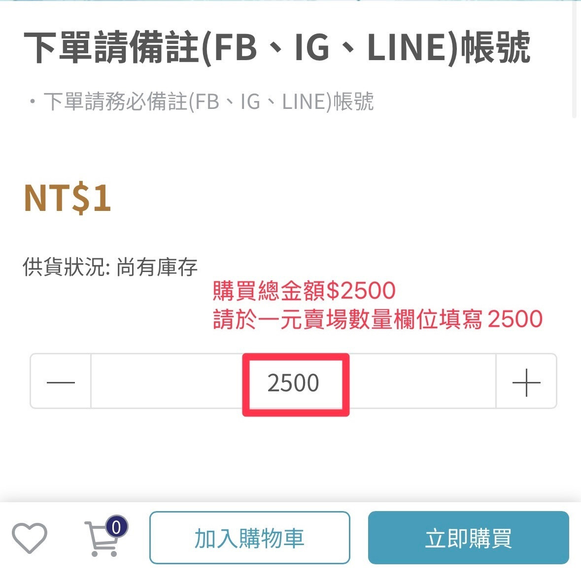 EX:購買總金額2,500,請於1元賣場「數量欄位」填寫2,500